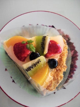 黄桃、洋梨、キウイ、苺、ブルーベリーで飾った華やかなケーキです。不二家のタルト台はカスタードクリームとスポンジと、固すぎず柔らかすぎず程良い食感のタルト生地が絶妙なんですよ(*´▽`*)